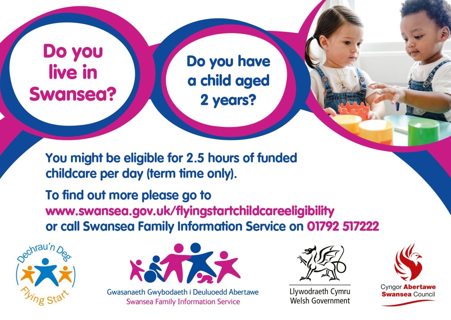 - Funded, high-quality, part-time childcare for children between the ages of 2 and 3 years through the medium of English or Welsh.